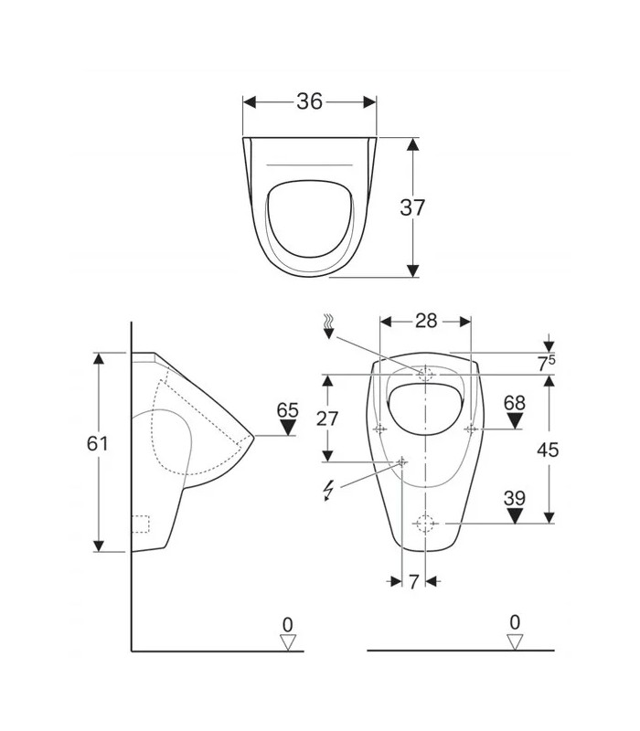 Geberit Renova Nr. 1 pisoár 235300000 + automatické splachování, přívod zezadu, odpad dozadu. Rozměr šířka: 36 cm x hloubka: 37 cm x výška: 61 cm. Nově je tento model označen jako: Geberit Selnova 500.344.01.1. K tomu automatické splachování na 6 V baterii, model Allia od firmy Keramag. Výrobek je vyzkoušený přímo v kombinaci s tímto modelem. 6 V kvalitní baterie vydrží až 2 roky do další výměny.
