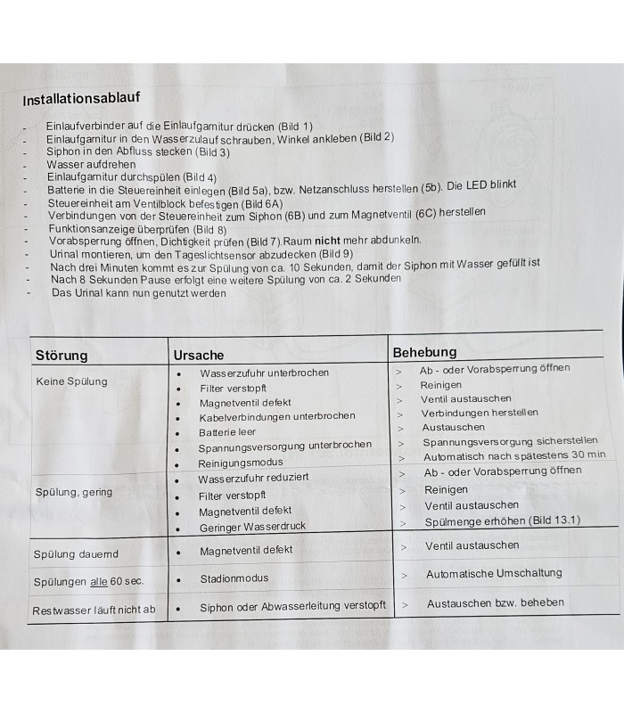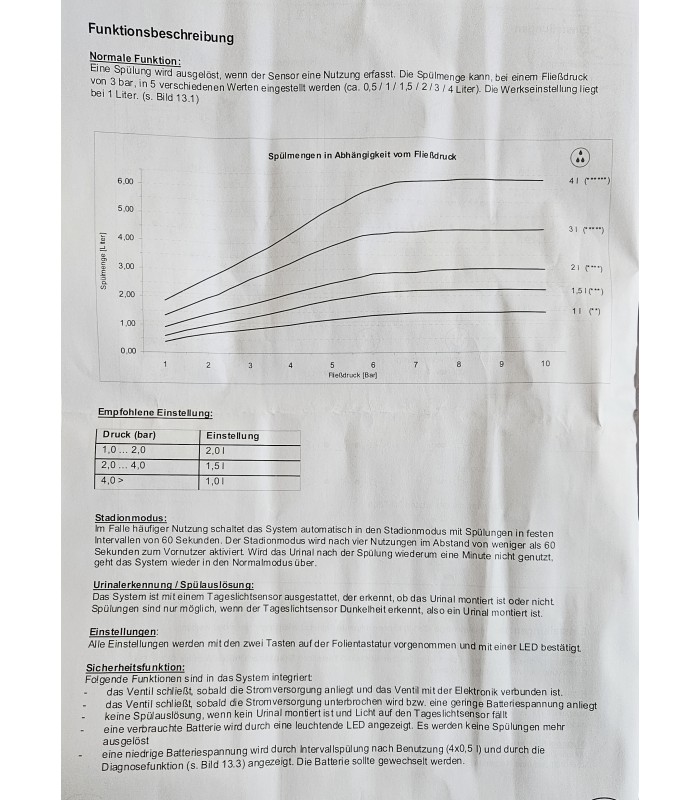 Automatické splachování: na ovladači lze nastavit množství průtoku vody. Výkon 1 litr při průtoku 3 bary, Nastavení na 3 bary 1 až 3 litry. Stisknutím levého tlačítka na 1 sekundu se hodnota zvýší na 4 litry. Nastavení se zobrazí jako blikající sekvence. Lze nastavit hygienické proplachování - 24 hodin nebo 72 hodin. Zabraňuje dehydrataci sifonu. V případě dlouhého období bez použití bude automaticky splachovat. Hygienické oplachování můžete vypnout.