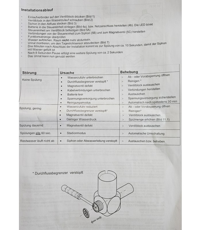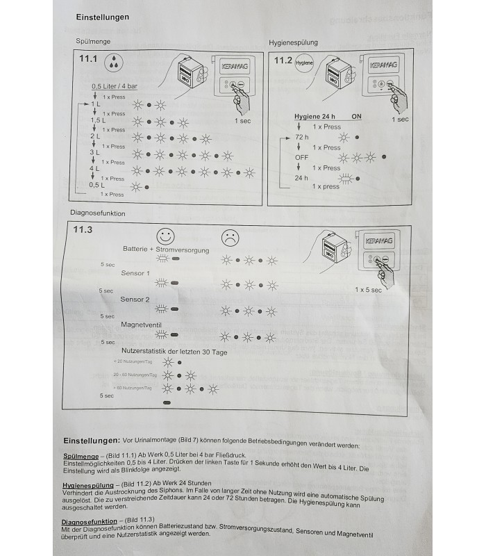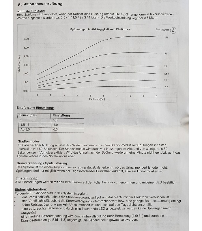 Automatické splachování: na ovladači lze nastavit množství průtoku vody. Výkon 1 litr při průtoku 3 bary, Nastavení na 3 bary 1 až 3 litry. Stisknutím levého tlačítka na 1 sekundu se hodnota zvýší na 4 litry. Nastavení se zobrazí jako blikající sekvence. Lze nastavit hygienické proplachování - 24 hodin nebo 72 hodin. Zabraňuje dehydrataci sifonu. V případě dlouhého období bez použití bude automaticky splachovat. Hygienické oplachování můžete vypnout.
