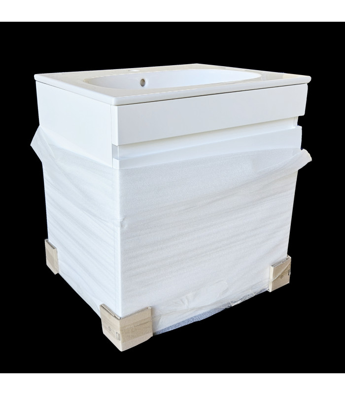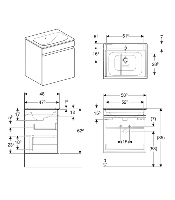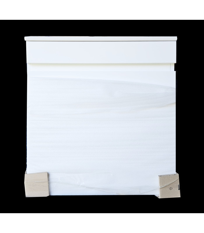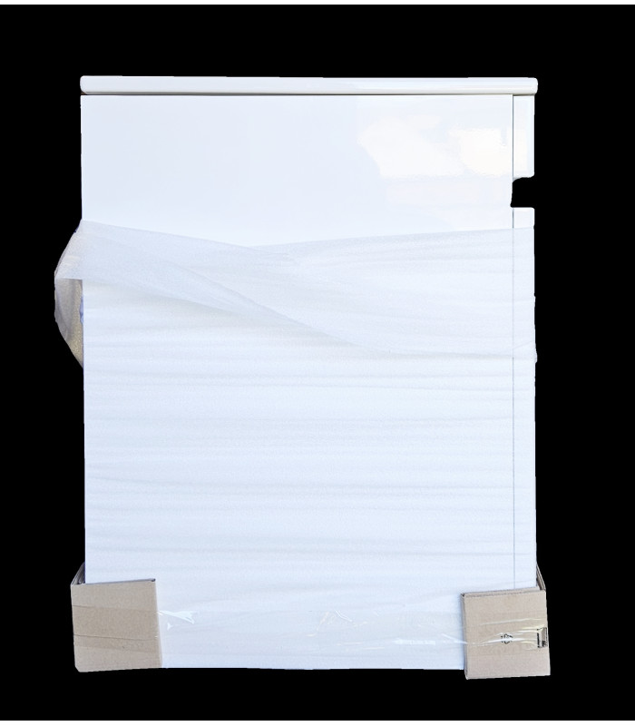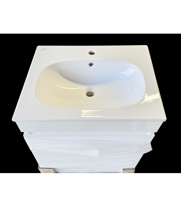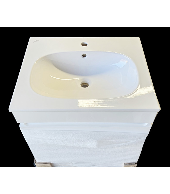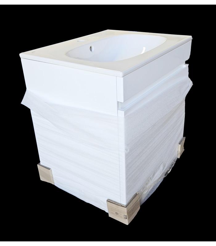 Prodej kompletu... Geberit Renova Plan 501.915.01.1, závěsná koupelnová skříňka barvy bílá lesklá, jedna veliká zásuvka a jedna vnitřní malá zásuvka, vnitřní korpus šuplíků matně šedý. Nosnost šuplíku max 30 kg. Rozměr: 60 x 62,2 x 48 cm. Váha 38,66 kg včetně s umyvadlem. Včetně šroubů k zavěšení. Stav zcela nová, jen částečně vybalená. Originální umyvadlo chybí a doplnili jsme jej umyvadlem viz níže, které rozměrově na 100% souhlasí s originálem.