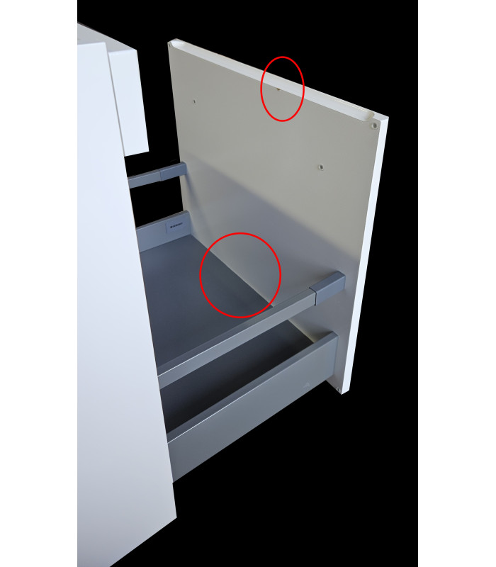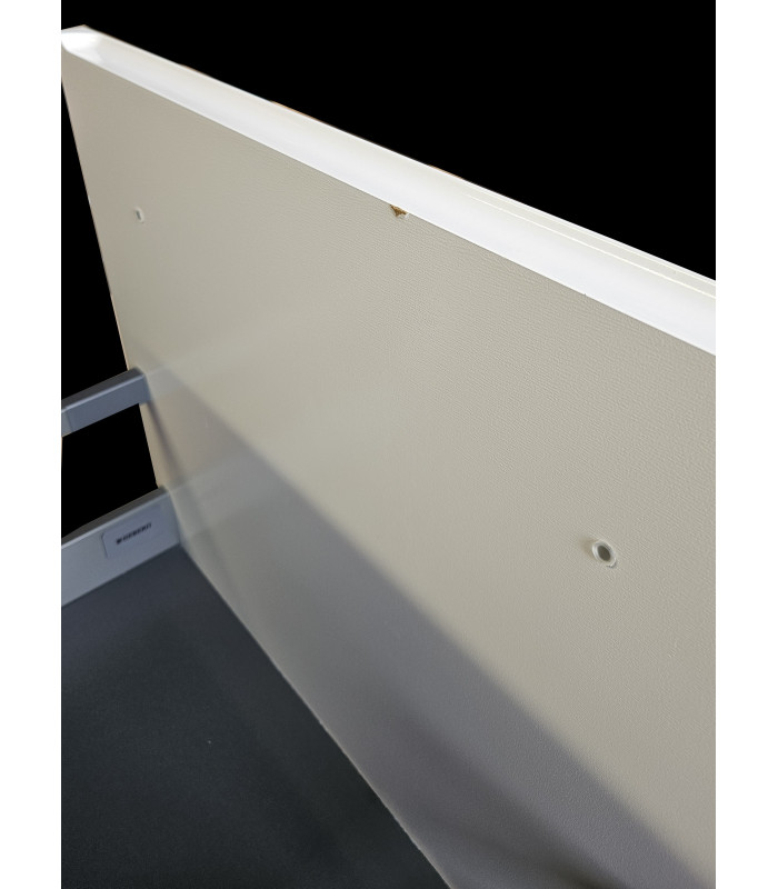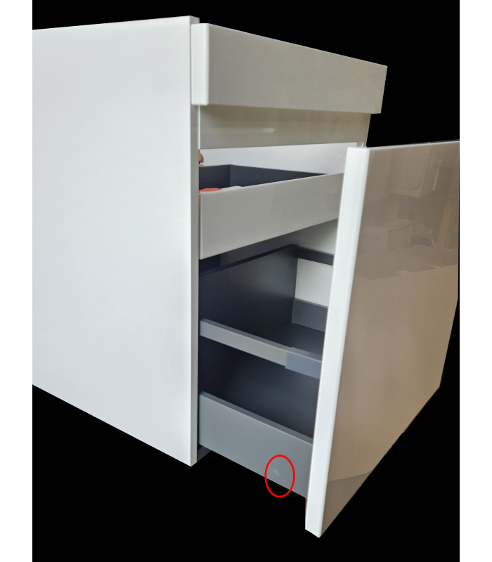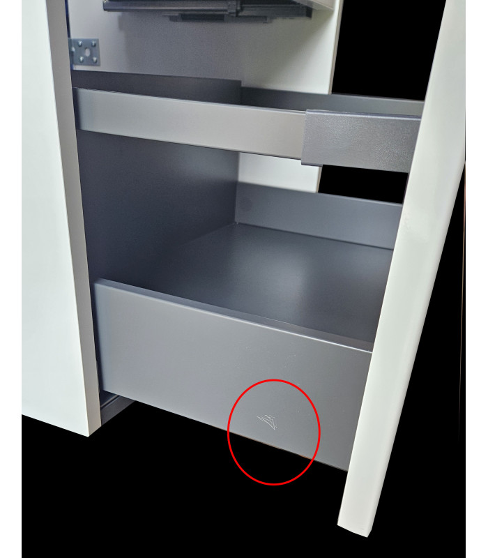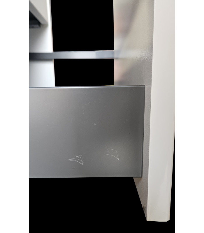 POZOR poničení: spodní velký šuplík po otevření je vlevo na boku lehce poškrábaný, dále spodní šuplík po vysunutí nahoře zevnitř má 1 cm zničenou barvu a poslední vada je uvnitř velkého šuplíku spoj mezi podlahou a přední plochou je horší, vše viz fotogalerie.