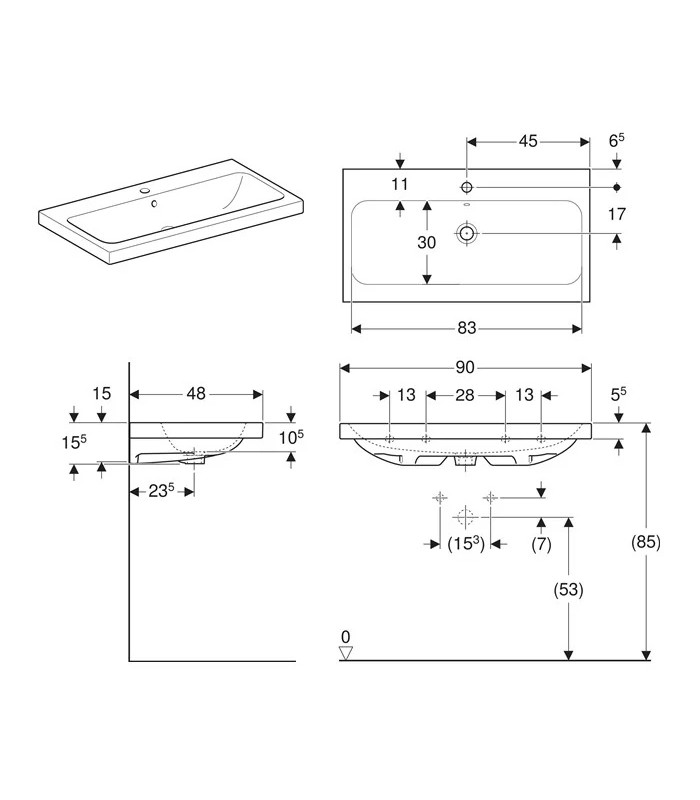 Geberit iCon Light 501.836.00.2 KeraTect, moderní tenké/ slim provedení, koupelnové umyvadlo, rozměr šířka 90 x hloubka 48 cm a výška okraje pouze 5,5 cm, s otvorem pro baterii, s přepadem, k zavěšení. Váha 24,5 kg. Kombinovatelné se spodními skříňkami Geberit č.: