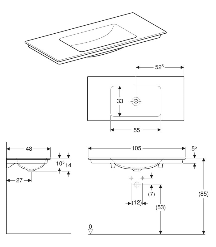 Geberit 505.011.00.4 glazura KeraTect série ONE, nábytkové umyvadlo, rozměr šířka 105 x hloubka 48 x výška 14 cm včetně výšky odpadu. Extra tenké/ slim. Bez přepadu, pro baterii ze zdi. Váha 17,41 kg. Prostorově úsporný protizápachový sifon pro sérii ONE není součástí balení 152.089.01.1, nebo 152.099.01.1. K montáži na spodní skříň model Geberit: