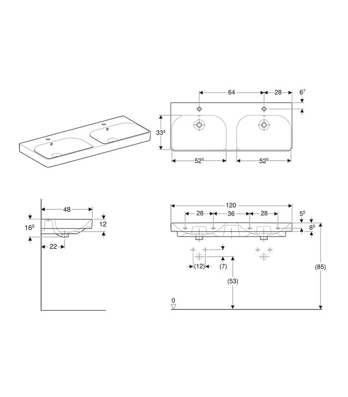 Geberit dvojumyvadlo Smyle Square 500.223.01.1, k zavěšení, na dvě baterie a dva odpady s přepadem. Rozměr šířka 120 x výška 8,5 (16,5) x hloubka 48 cm, váha 32,3 kg. Kombinovatelné se spodní skříňkou: 500.356.00.1, 500.356.JK.1, 500.356.JL.1, 500.356.JR.1.