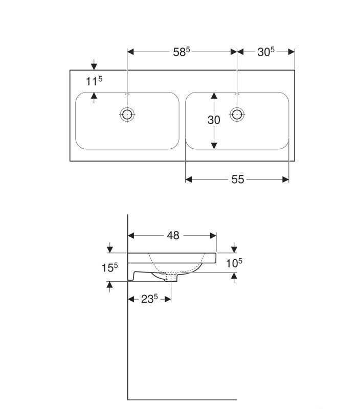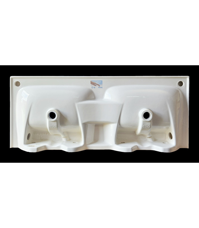 Geberit dvojumyvadlo iCon Light 501.838.00.4 moderní zúžené provedení, KeraTect, pro dvě baterie ze zdi, dva přepady a dva odpady, k zavěšení. Rozměr šířka 120 x výška okraje 5,5 x hloubka 48 cm.
