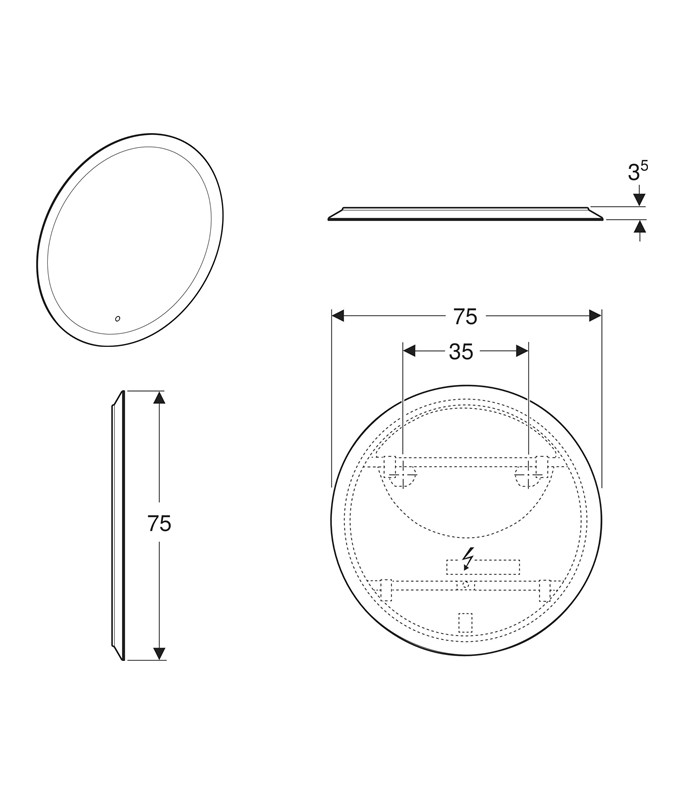Zrcadlo Geberit Option Round 502.798.00.1, kulaté průměr 75 cm, tloušťka 3,5 cm, materiál rámu hliník, 220-240 V AC, 50/60 Hz, IP 44, ochranná třída II., světlo LED 24 V DC, 3000 K, příkon 62,2 W, 7800 lm. Ovládané dotykem přes světelné ,,kolečko" v ploše zrcadla, plynule ztmívatelné, ve fotogalerii nafocené: vypnuté, tlumené a nejvíce rozsvícené (bohužel rozdíl mezi ztlumené a na nejvíc nejde z fotek příliš poznat). Včetně materiálu k zavěšení. Váha 6,5 kg.