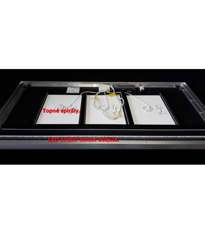 POZOR vady: druhý/ třetí a čtvrtý senzor nespíná. Tedy zadní světlo kolem dokola svítí správně a lze vypnout i zapnout pomocí prvního senzoru, nebo pomocí externího vypínače na zdi. Světelná lišta nahoře na zrcadle lze zapnout jen pomocí externího vypínače na zdi, ale jen zapnout a vypnout, nelze upravit zvýšit či snížit svítivost. Síla světla na horní liště je střední, via foto ve fotogalerii rozsvícené lišty. Topné spirály jsou funkční.