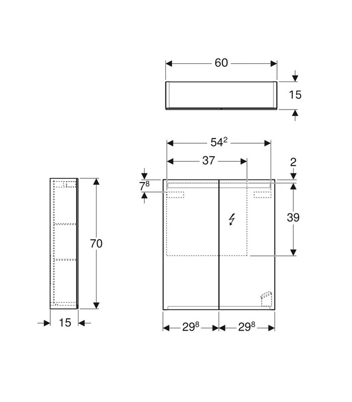 Geberit Option 500.582.00.1 koupelnová zrcadlová skříňka/ dříve model Keramag 801460, boky zrcadlo, dvířka z obou stran zrcadlo, uvnitř bílá matná. Korpus je z třívrstvé dřevotřísky velmi odolné vůči vlhkosti. Na proud 230 V, ~50 Hz. IP 44, ochranná třída I., třída A++.